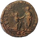 Trophy with shield in left hand and spear in right hand; at ground left, a Jewess seated to right, head in her hands; at ground right, naked Jewish captive seated to right, looking back up towards the trophy; on either side, moneyer mark.