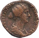 Vesta veiled, seated left between large SC, holding a sceptre in left hand and patera in right hand; above, inscription.
